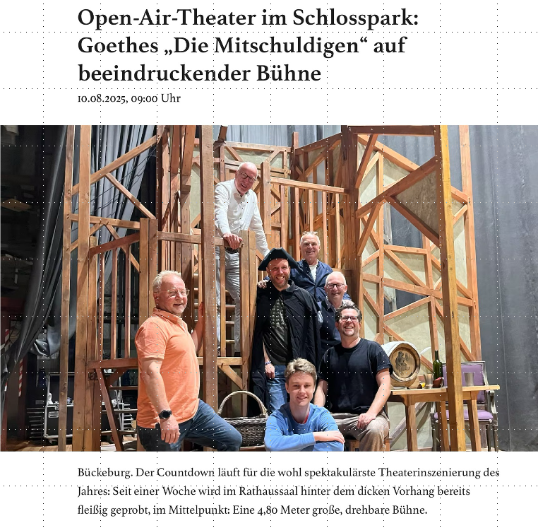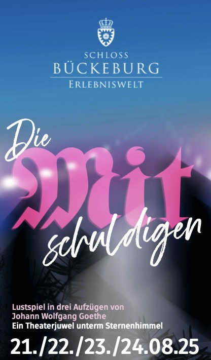 Der überwältigende Erfolg des "FAUST 1" im Jahr 2024 hatte uns ermutigt, auch in 2025 ein attraktives Stück im Schlosspark Bückeburg anzubieten. In der romantischen, von alten Bäumen geprägten Atmosphäre spielten wir DIE MITSCHULDIGEN ein frühes Lustspiel von J. W. Goethe. Auch das wurde erfreulich gut angenommen. Erstmals hatten wir, auf Wunsch von Zuschauern das Jahr davor, ein Podest für etwa die Hälfte der Zuschauer errichtet, um auch im hinteren Bereich gute Sicht auf die Bühne zu ermöglichen.