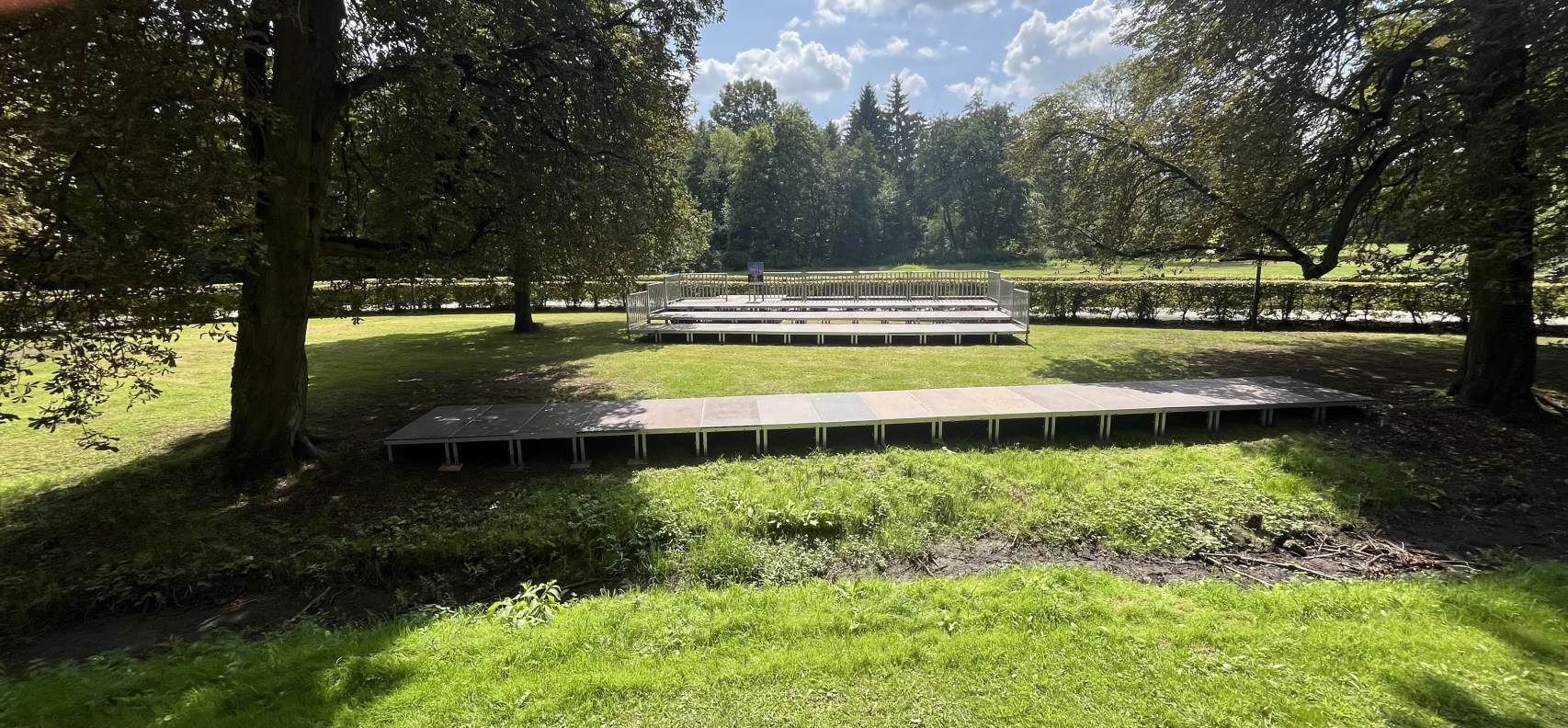 Der überwältigende Erfolg des "FAUST 1" im Jahr 2024 hatte uns ermutigt, auch in 2025 ein attraktives Stück im Schlosspark Bückeburg anzubieten. In der romantischen, von alten Bäumen geprägten Atmosphäre spielten wir DIE MITSCHULDIGEN ein frühes Lustspiel von J. W. Goethe. Auch das wurde erfreulich gut angenommen. Erstmals hatten wir, auf Wunsch von Zuschauern das Jahr davor, ein Podest für etwa die Hälfte der Zuschauer errichtet, um auch im hinteren Bereich gute Sicht auf die Bühne zu ermöglichen.